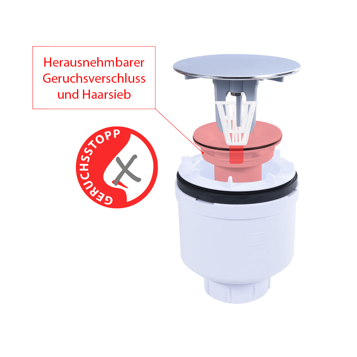 - Lieferumfang: Siphon, Abdeckung Chrom, Haarsieb